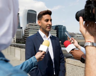 Black Male Politician and Associate Shaking Hands in front of Flashing Cameras