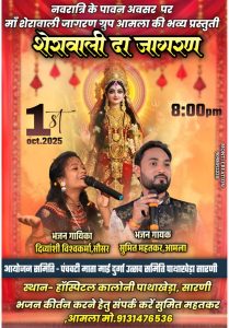 दिनांक 1अक्टूबर 2025 को जो कि समिती बड़े उत्साह एवं हर्ष के साथ आयोजित करने जा रही हैं। जिसमें माता शेरावाली के प्रति रात भर जागरण, गीत, नृत्य और पूजा-अर्चना की जाएंगी। वही अगर शेरावाली जागरण की बात करें तों