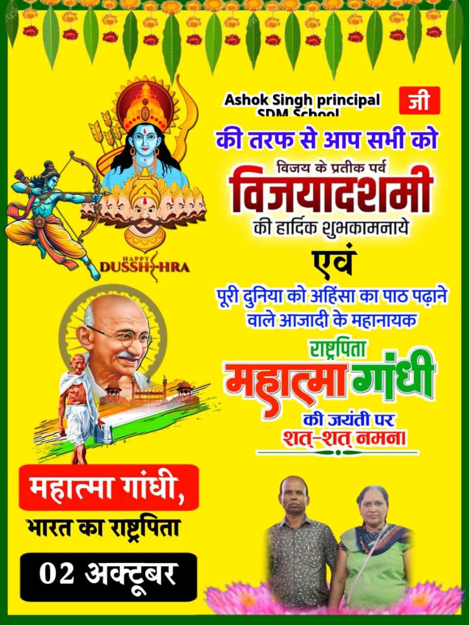 “पाथाखेड़ा:” श्री अशोक कुमार सिंह ने कहा 2 अक्टूबर को देशभर में प्रतिवर्ष महात्मा गांधी जी की जयंती के रूप में मनाया जाता है। चुके इस दिन गांधी जयंती के साथ ही 2 अक्तूबर को अंतरराष्ट्रीय अहिंसा दिवस के रूप में भी जाना जाता है। जबकि इस वर्ष विश्वभर में गांधी जी की 156वीं जयंती मनाई जा रही है, जिसे एसडीएम स्कूल परिवार शत शत नमन करता है। वही श्री अशोक कुमार सिंह ने विजयादशमी और दशहरा पर रोशनी डालते हुए शुभकामनाएं एवं बधाइयां प्रेषित की है। श्री सिंह ने कहा विजयादशमी और दशहरा एक ही दिन मनाए जाने वाले दो अलग-अलग त्योहार हैं। चुकी दशहरा भगवान राम द्वारा रावण के वध और बुराई पर अच्छाई की जीत का प्रतीक है, वही विजयादशमी देवी दुर्गा द्वारा महिषासुर के वध और सत्य पर असत्य की जीत का प्रतीक है। दोनों त्योहारों का अर्थ बुराई पर अच्छाई की विजय है, किंतु यह अलग-अलग पौराणिक कथाओं पर आधारित बताया जाता हैं।