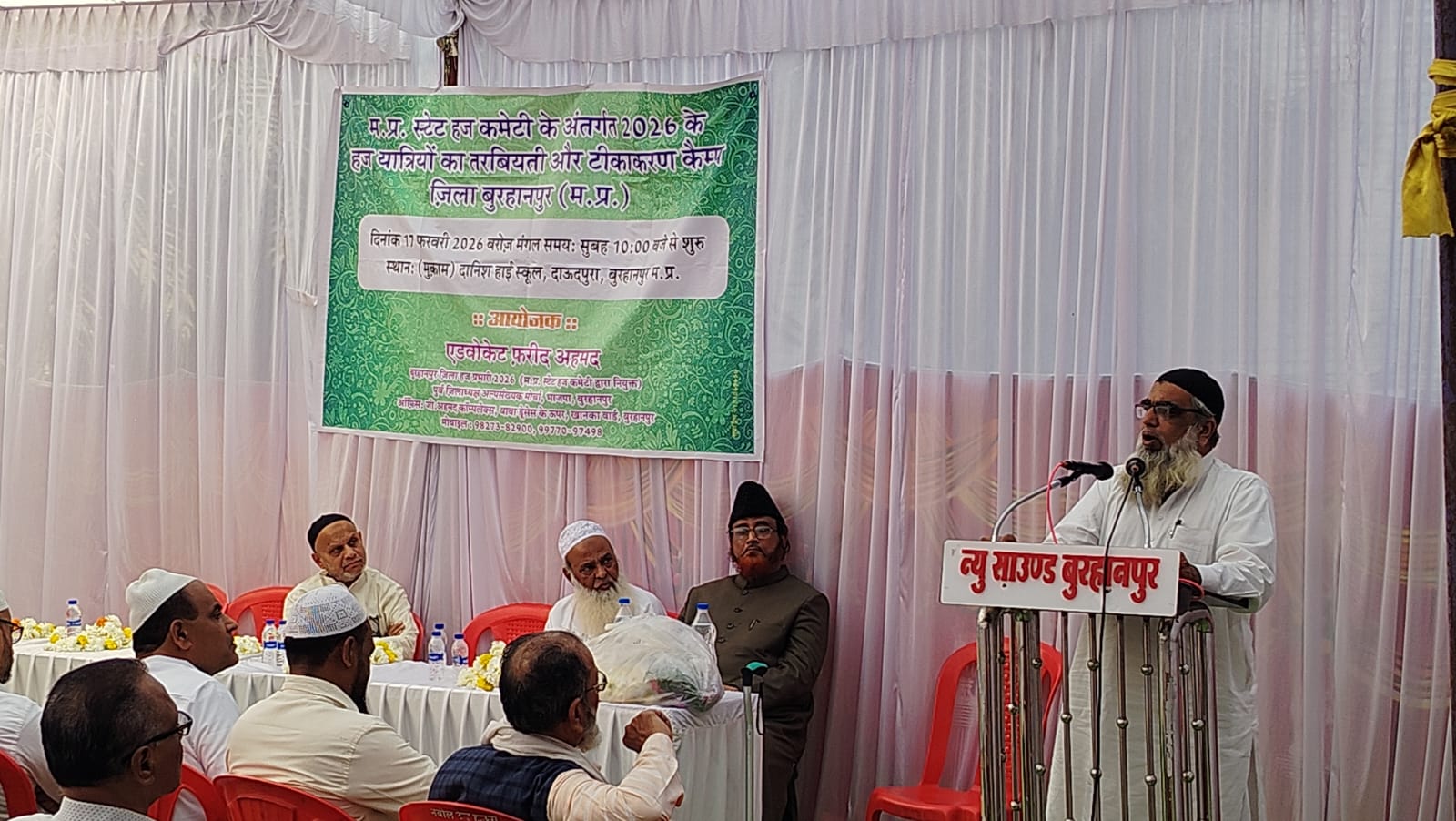 दाउदपुरा, बुरहानपुर के कैंपस में मध्य प्रदेश स्टेट हज कमेटी भोपाल द्वारा नियुक्त जिला हज कमेटी प्रभारी 2026 एवं वरिष्ठ अधिवक्ता फ़रीद अहमद द्वारा हज 2026 पर जा रहे आज़ेमीन हज के लिए पुरानी परंपरा अनुसार हज तरबियती और टीकाकरण कैंप बुरहानपुर की मशहूर मारूफ़ शख्सियत, और मक्का और मदीना सहित बुरहानपुर में बरसों से अल्लाह की रज़ा के लिए इंतेहाई खामोशी के साथ हज और उमरा पर जा रहे लोगों की खिदमत कर रहे सच्चे खादिम, कोका-कोला कंपनी मदीना मुनव्वरा में एक्स मैनेजर रहे अलहाज शेख अब्दुल क़ादिर इब्ने मरहूम डॉ शेख महबूब (QTS ग्रुप) की सदारत और शाही जामा मस्जिद बुरहानपुर के खतीब व ईमाम हज़रत सैयद इकराम उल्लाह बुखारी साहब क़िबला के चश्मे चिराग़, शाही जामा मस्जिद बुरहानपुर के युवा मुतवल्ली, हर दिल अज़ीज़ युवा धार्मिक विद्वान हज़रत सैयद मोहम्मद अनवार उल्लाह बुखारी साहब की सरपरस्ती में मुनअक़िद हुआ। इस प्रोग्राम में मुख्य वक्ता के रूप में शाही ईदगाह सिंधी बस्ती बुरहानपुर और मस्जिद बाबुल हक @ पानदरी मस्जिद लोहार मंडी रोड बुरहानपुर के खतीब व इमाम हाफ़िज़ रईस साहब ने हज के ताल्लुक से अहम मालूमात फराहम की।हज कमेटी ऑफ इंडिया मुंबई के ट्रेनर मोहम्मद मोईन मतीन ने हज 2026 में हज कमेटी द्वारा दी जाने वाली ख़िदमात और हज की गाइडलाईन से अवगत कराया। प्रोग्राम में दिलीप श्रॉफ, पूर्व ज़िला अध्यक्ष भाजपा, नरेंद्र शिंदे, खंडवा सांसद श्री ज्ञानेश्वरपाटिल के प्रतिनिधि,डॉ एस एम तारिक,दानिश हाई स्कूल बुरहानपुर के संचालक एडवोकेट सैयद जावेद मीर, खानक़ाह मस्जिद, बुरहानपुर के सदर हाजी सैय्यद शहज़ाद अली, ऑल इंडिया हज वेलफेयर सोसाइटी बुरहानपुर के अध्यक्ष हाजी मोहम्मद अली अंसारी उर्फ दादा, ऑल इंडिया हाई जे वेलफेयर समिति के सचिव अब्दुल रज़्ज़ाक सिद्दीकी, रियाज़ुल हक़ अंसारी, मोहम्मद क़दीर तेली, मोमिन जमात बुरहानपुर के पूर्व सचिव एडवोकेट हाजी शाहिद मोहम्मद अंसारी, दाउदपुरा वार्ड के पार्षद प्रतिनिधि हमीद उल्लाह खान डायमंड, अल्पसंख्यक कांग्रेस बुरहानपुर के जिला अध्यक्ष डॉ. इमरान खान, आल इंडिया हज वेलफेयर सोसाइटी बुरहानपुर के समस्त सदस्यगण मौजूद थे। प्रोग्राम की शुरुआत तिलावते कुरआन ए पाक से हाफ़िज़ रईस साहब ने की, उसके बाद नआत ए पाक का नज़राना क़ारी अब्दुल रशीद साहब(इमाम मस्जिद हिंदुस्तानी, बुरहानपुर) ने पेश किया। आज़मीन हज का मेडिकल चेकअप डॉ मुमताज़ अंसारी और डॉ हुस्ना फहमी ने किया। पुरुष वर्ग में टीकाकरन का कार्य पूर्व वर्षों के अनुसार डॉ एस एम सादिक,डॉ शाहिद हुसैन, डॉ जावेद खान,डॉ ज़फ़र इक़बाल की टीम ने किया, वहीं महिला वर्ग में टीकाकरण का काम वरिष्ठ महिला चिकित्सक हज्जिन डॉक्टर नसरीन खानम खान, डॉक्टर हिना शे