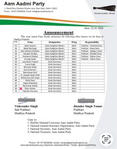 मैं मध्य प्रदेश के सभी नागरिकों से अपील करता हूँ कि वे आम आदमी पार्टी के साथ जुड़ें और पार्टी की विचारधारा को आगे बढ़ाने में अपना योगदान दें। हमारा उद्देश्य है कि मध्य प्रदेश को एक ऐसा राज्य बनाया जाए, जहां आम आदमी को न्याय मिले और उनके हितों की रक्षा की जाए।